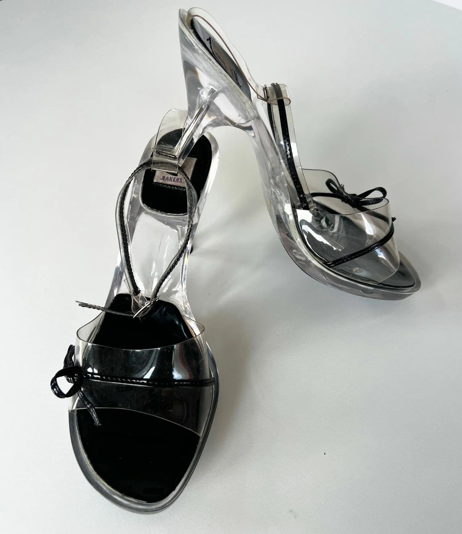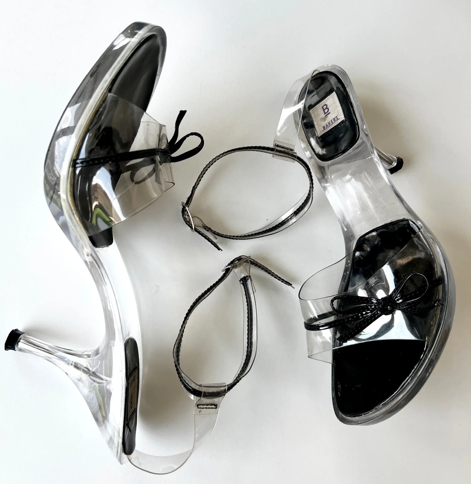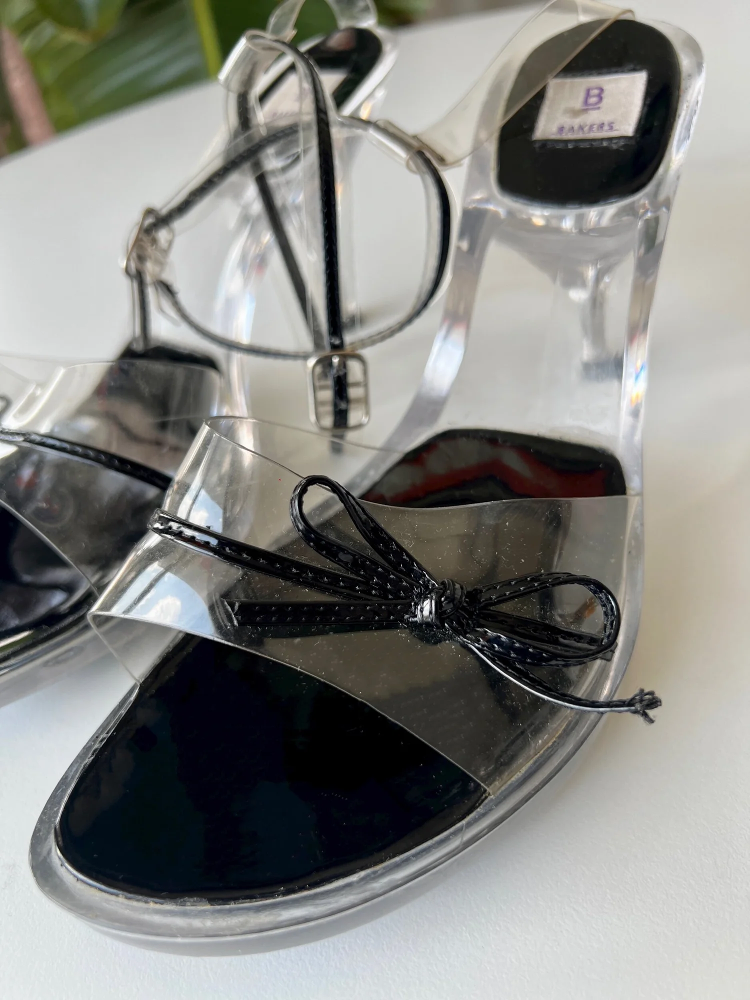 Clear acrylic platform heels with stylish accent bow ties. Stylish yet comfortable and can pair back to any outfit!